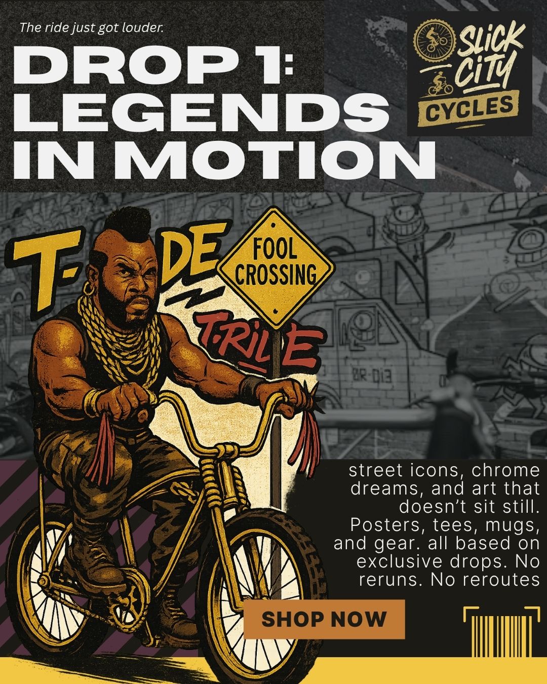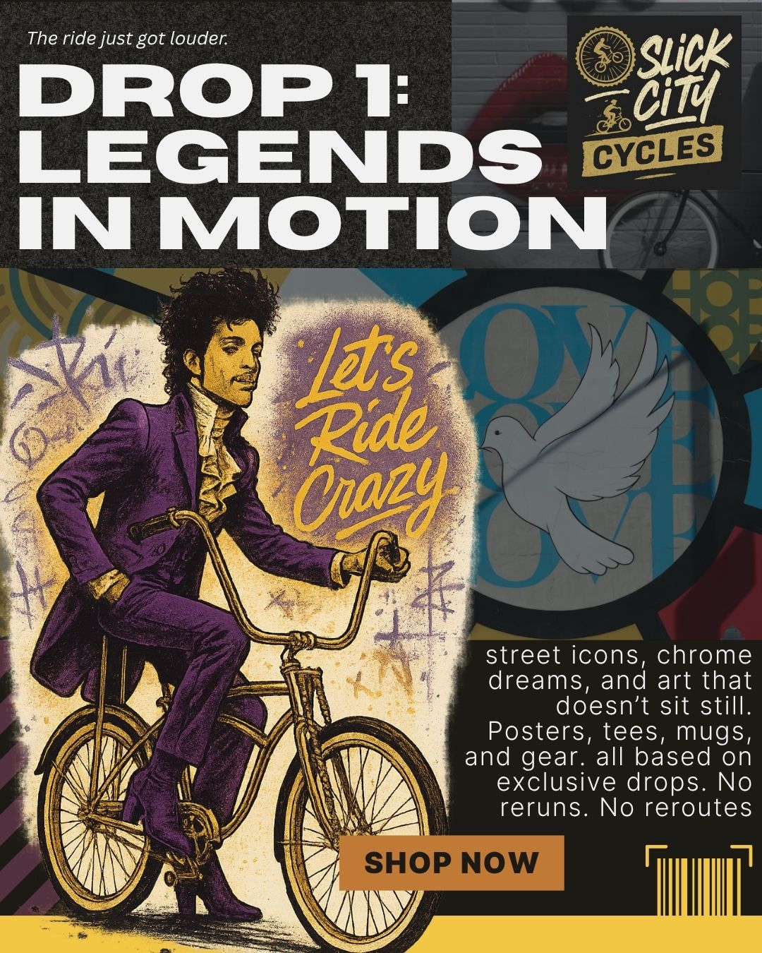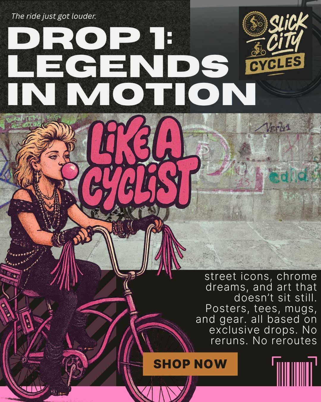 Legends in Motion is the inaugural drop from Slick City Cycles, reimagining iconic figures from the 1980s as street-savvy cyclists rolling through graffiti-slicked cityscapes. Each piece is a digital tribute to attitude, energy, and rebellion — where banana seat bikes meet boombox bravado, and chrome lowriders collide with velvet royalty.
